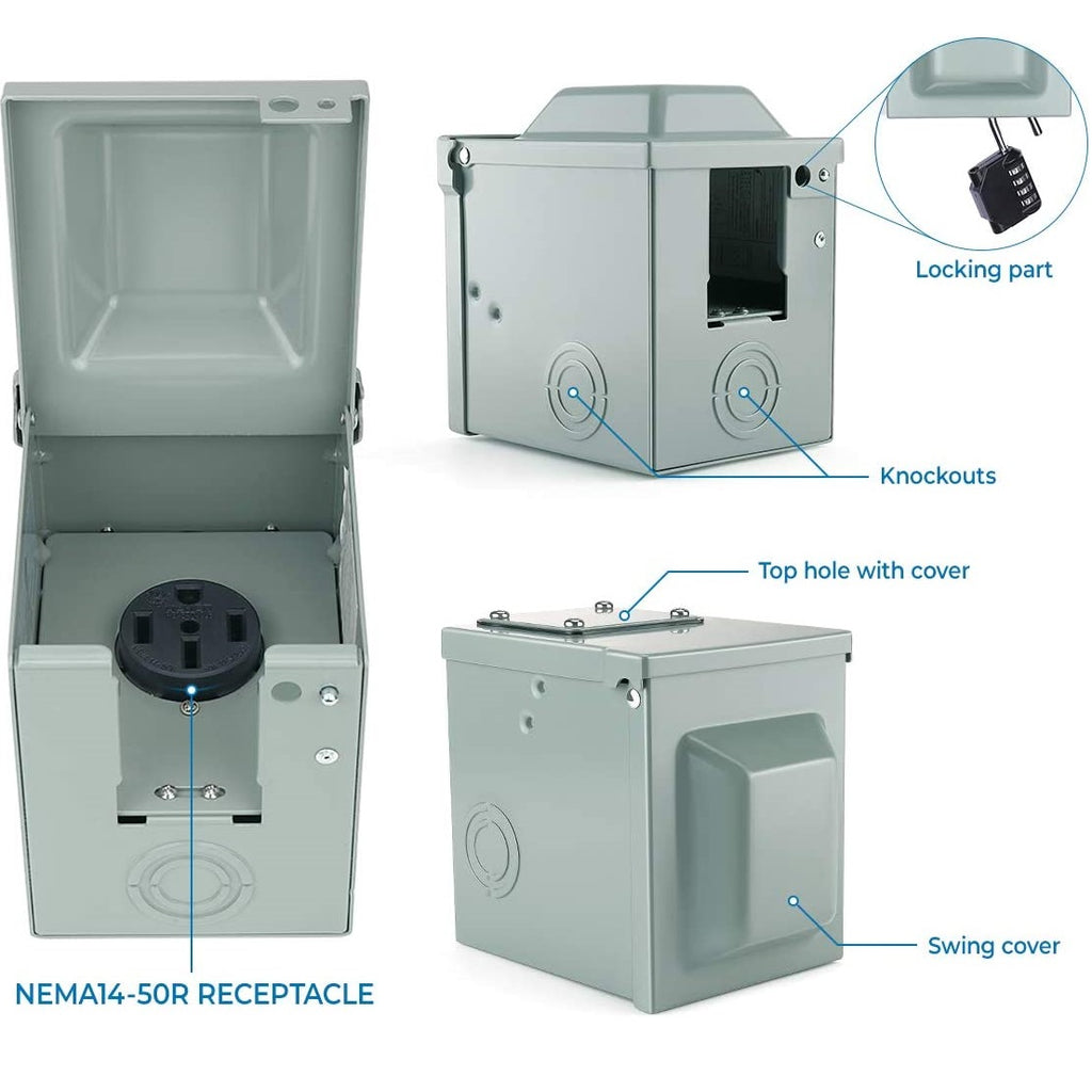 -Salida eléctrica de 50 A 125V/250V RV, receptáculo NEMA 14-50R con carcasa tipo 3R resistente a la lluvia que es compatible con el cable normal de 50A NEMA 14-50R RV