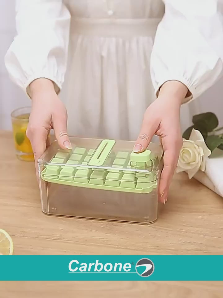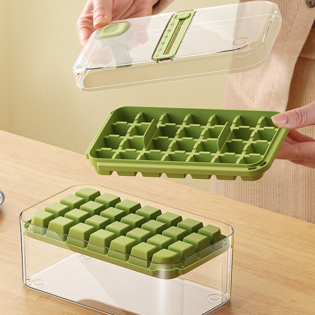 Bandeja para cubitos de hielo con tapa y contenedor. Moldes apilables para hielo. Color verde.