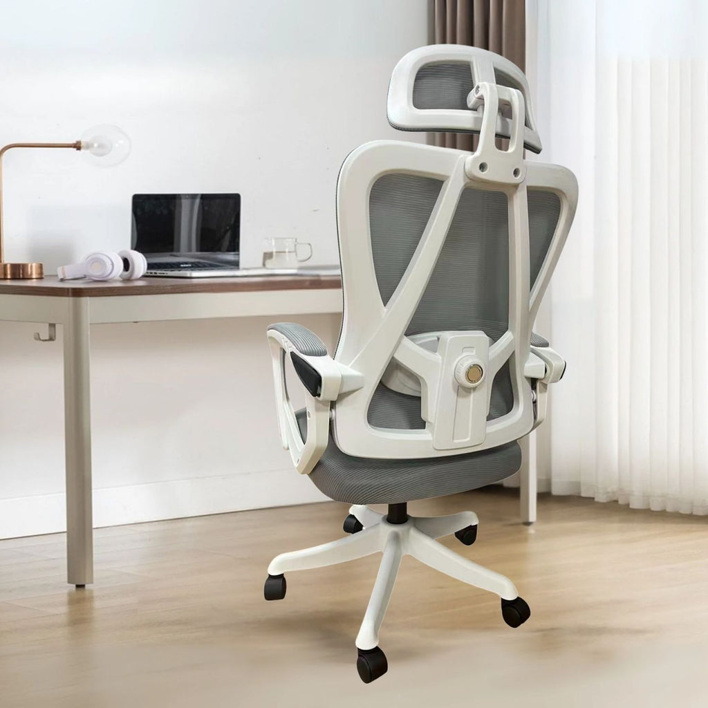 Silla de oficina ergonómica gris con respaldo de malla y apoyabrazos ajustables sin reposapiés
