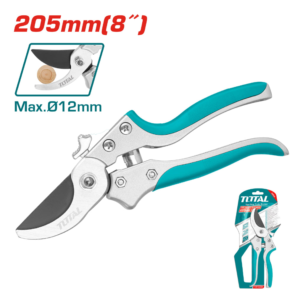 Tijera para podar arbustos de alta calidad. 8.0''''(205mm). Marco de metal durable, navaja de acero carbono #55 con teflón de tratamiento térmico. Mango de aluminio y agarre de TPR. Presentación blíster.