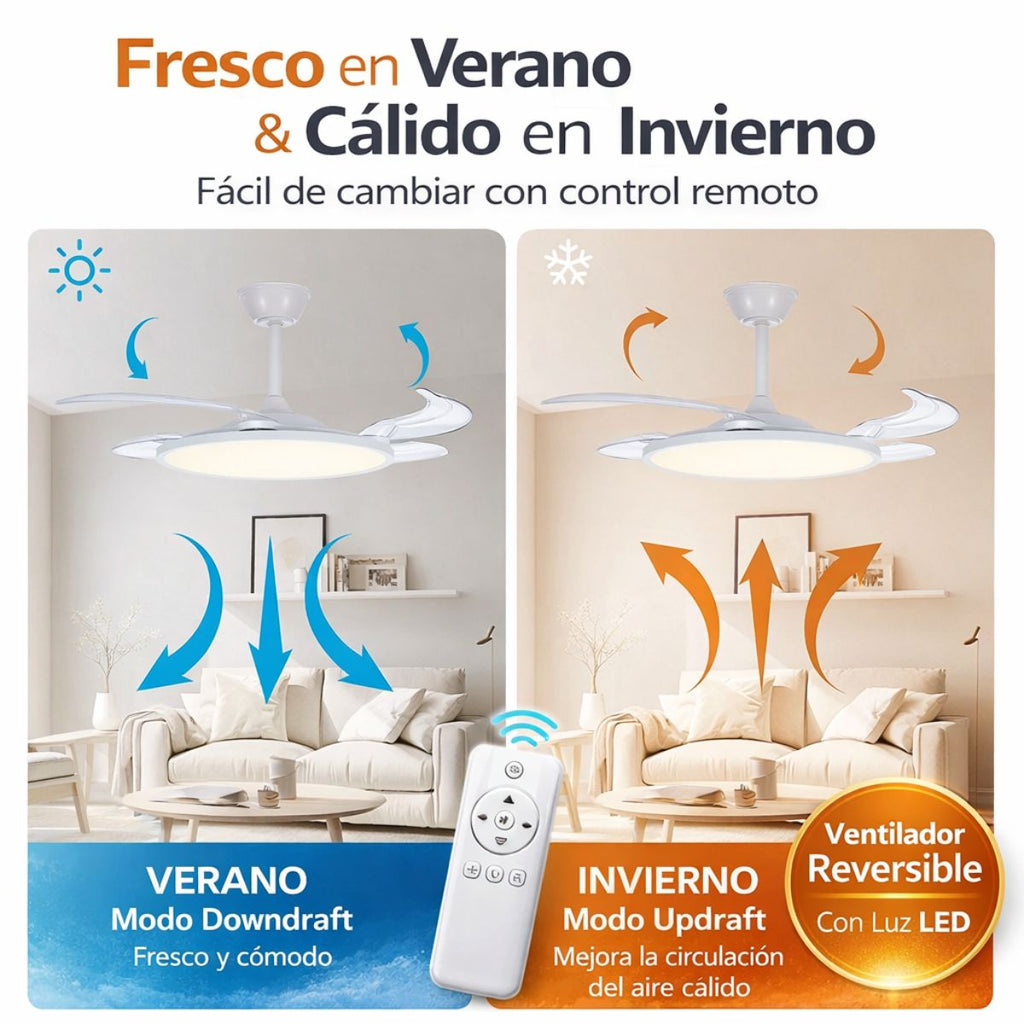 - Control remoto incluido para encendido, apagado, cambio de modos, ajuste de luz y control del abanico.