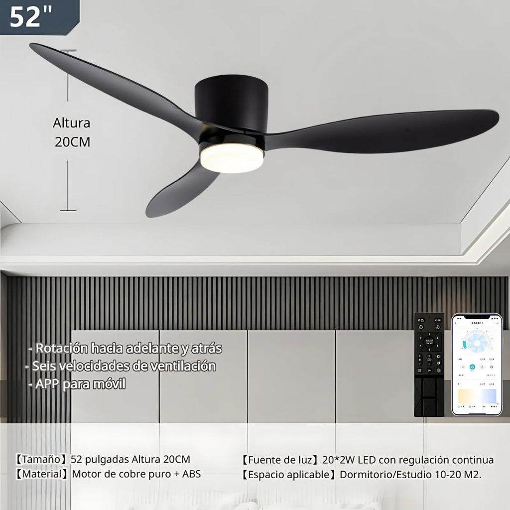 Abanico De Techo Con Lámpara. 3 tonos De Luz. 52'''' Ventilador Con Control Remoto y APP. Fan 110V Color negro
