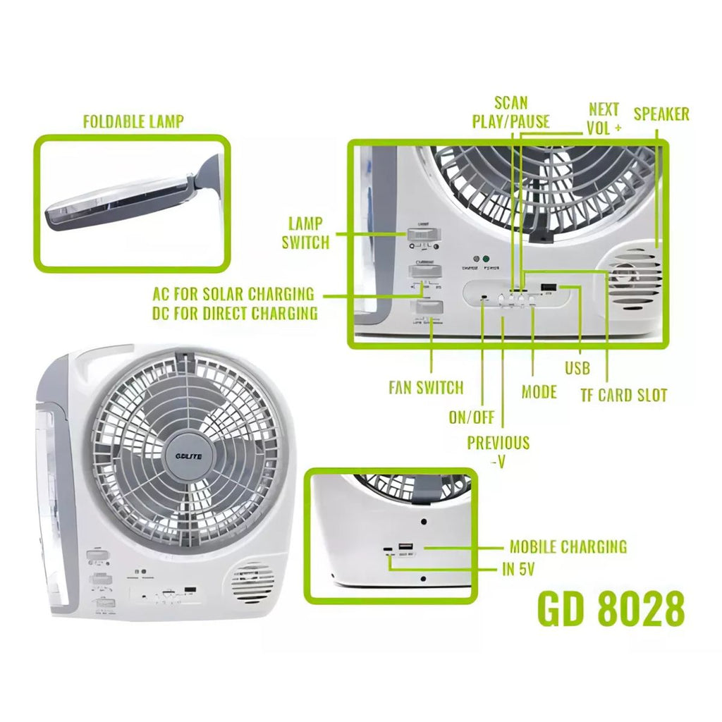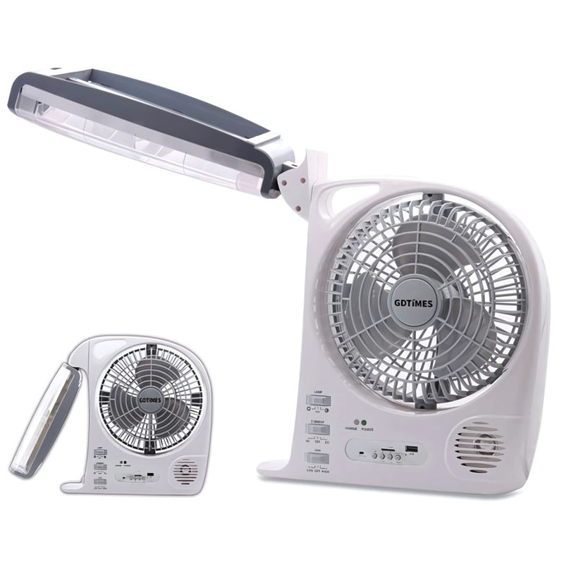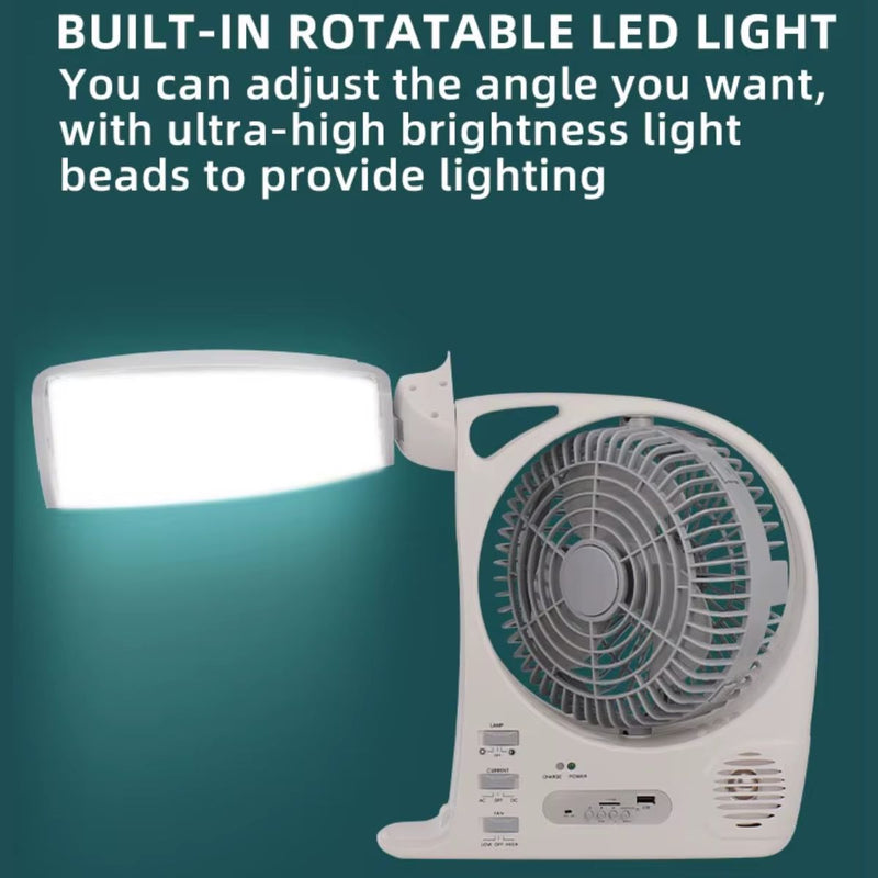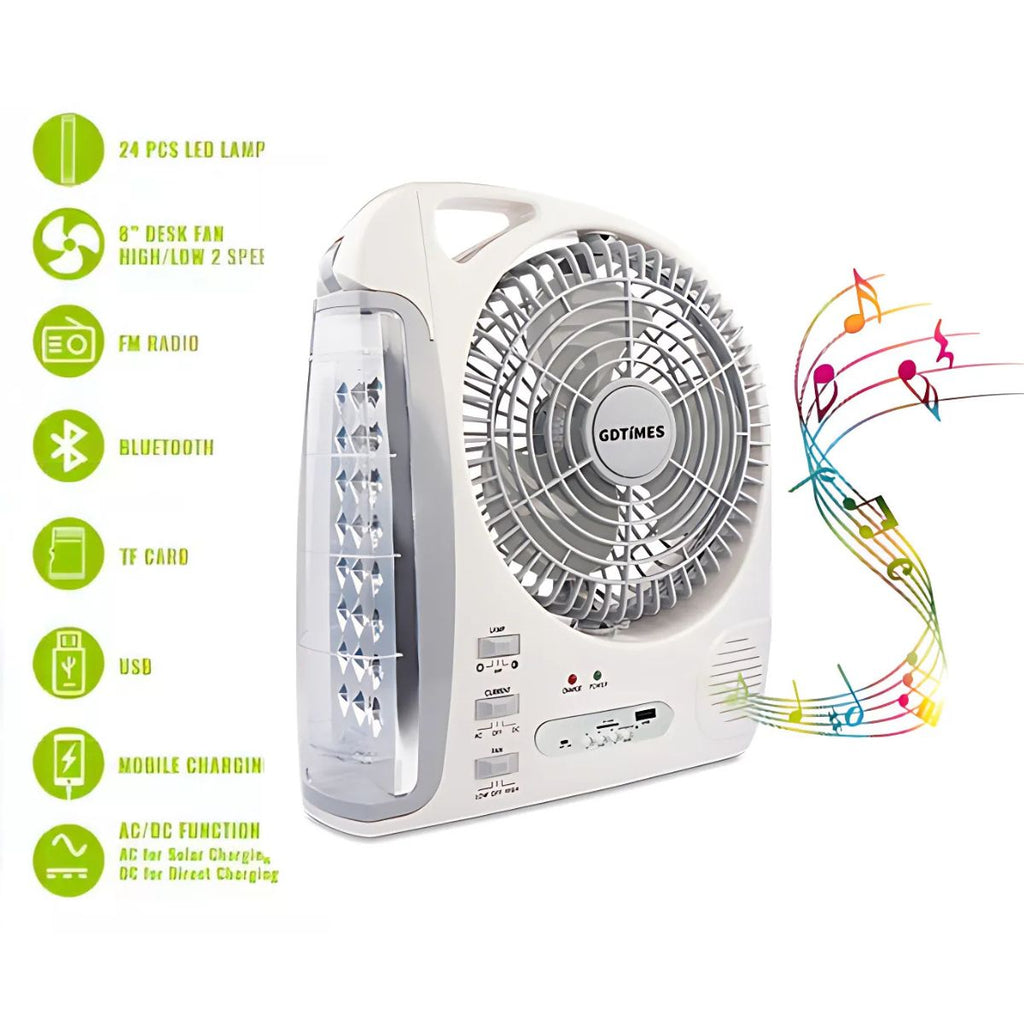 - 6 en 1 Multifuncional: Combina ventilador de escritorio de 8'''', lámpara LED de 24 piezas, radio FM, Bluetooth, reproductor de tarjeta TF y puerto USB para carga de dispositivos.