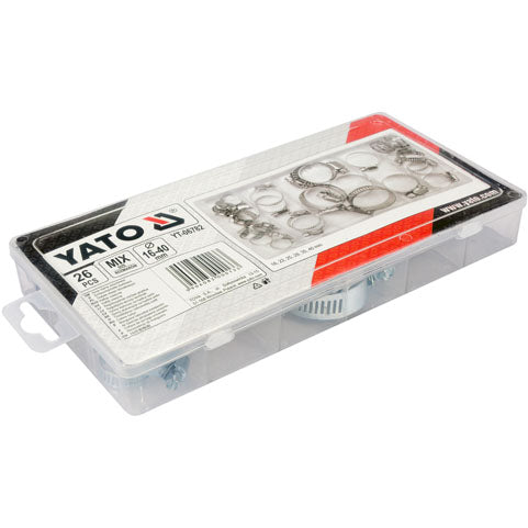 Yato 26 Piezas De Abrazaderas De Manguera Surtidas. 16 Mm: 8 Piezas; 22 Mm: 6 Piezas; 25Mm: 4Piezas; 28 Mm: 2Piezas; 35 Mm: 2 Piezas; 40Mm: 4 Piezas; Material: Hierro, Revestimiento De Zinc; Para Tubos De Diametro De 16 – 40 Mm; Estuche Plastico Abraza