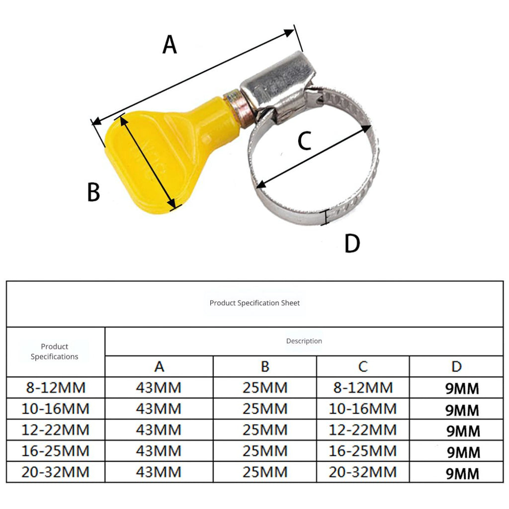 - Clasificación por Tamaño: Incluye abrazaderas en los siguientes rangos: 8-12mm, 10-16mm, 12-22mm, 16-25mm, 20-32mm.