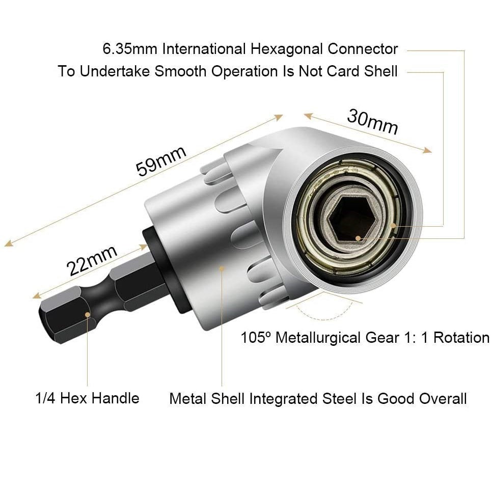 Adaptador de punta para taladro de ¼” en ángulo recto de 105°.