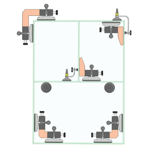 Ventosa con tope de soporte, Actúa como tope para sostener paneles de vidrio con ángulo de 90 ° para posicionar y poder pegar fácilmente vidrios con pegamento UV o adhesivo de silicona. El tope se puede ajustar (18mm) con la perilla. Ventosa de goma Ø120mm. Repuesto código (X201.01).