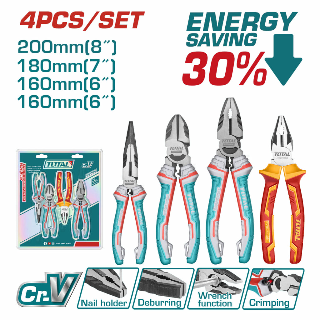 | Características | Alicates de Combinacion 8", Punta larga de 6",corte diagonal de 6" , combinación aislado 7" Set de 4 piezas. Salva 30% de fuerza. |