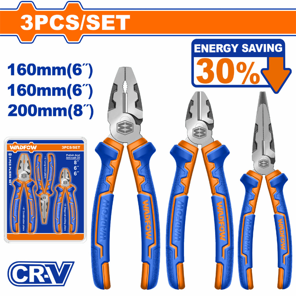 | Características | Alicates combinados de alto rendimiento de 8", alicates de corte diagonal de alto rendimiento de 6" y alicates de punta larga de alto rendimiento de 6". |