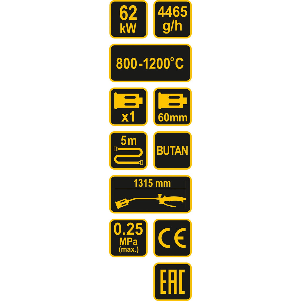 TEMPERATURA DE LLAMA 800°C-1200°C; ENERGÍA TÉRMICA 62KW; CONSUMO DE GAS 4465G/H; ANTORCHA DE GAS CON AJUSTE DE LLAMA; LONGITUD DE LA MANGUERA 5M; DIÁMETRO DEL QUEMADOR: 60 MM; LONGITUD DEL CONECTOR: 100CM