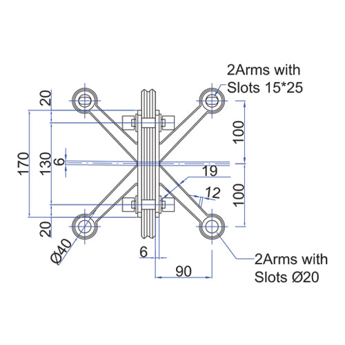 Araña de 4 vías con aleta. No incluye pernos. Brillante. Para construcción de fachadas de vidrio. Construidas a base de acero inoxidable 304 para vidrios de 8 a 26 mm de espesor. Compatible con los pernos para anclaje F/T32 , F/T02 y F/T01.