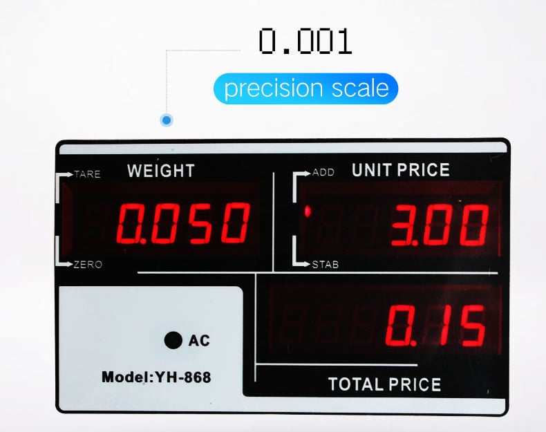 Cuenta con un sensor de alta precisión para brindar el peso correcto, estabilización de 3 segundos. Calibración externa.