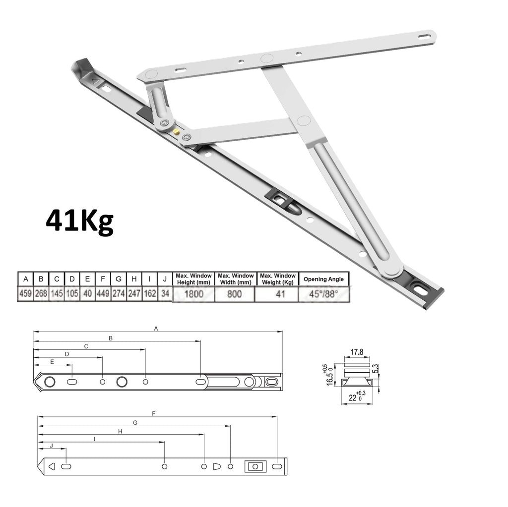 Cumple con los estándares internacionales de herrajes para puertas y ventanas, asegurando un funcionamiento confiable en proyectos residenciales y comerciales. Su diseño técnico proporciona estabilidad, soportando un peso máximo de 41 kg por hoja, con una apertura de 45°/88°, lo que la hace perfecta para sistemas de ventilación controlada.