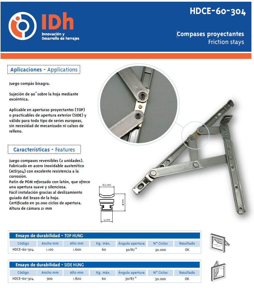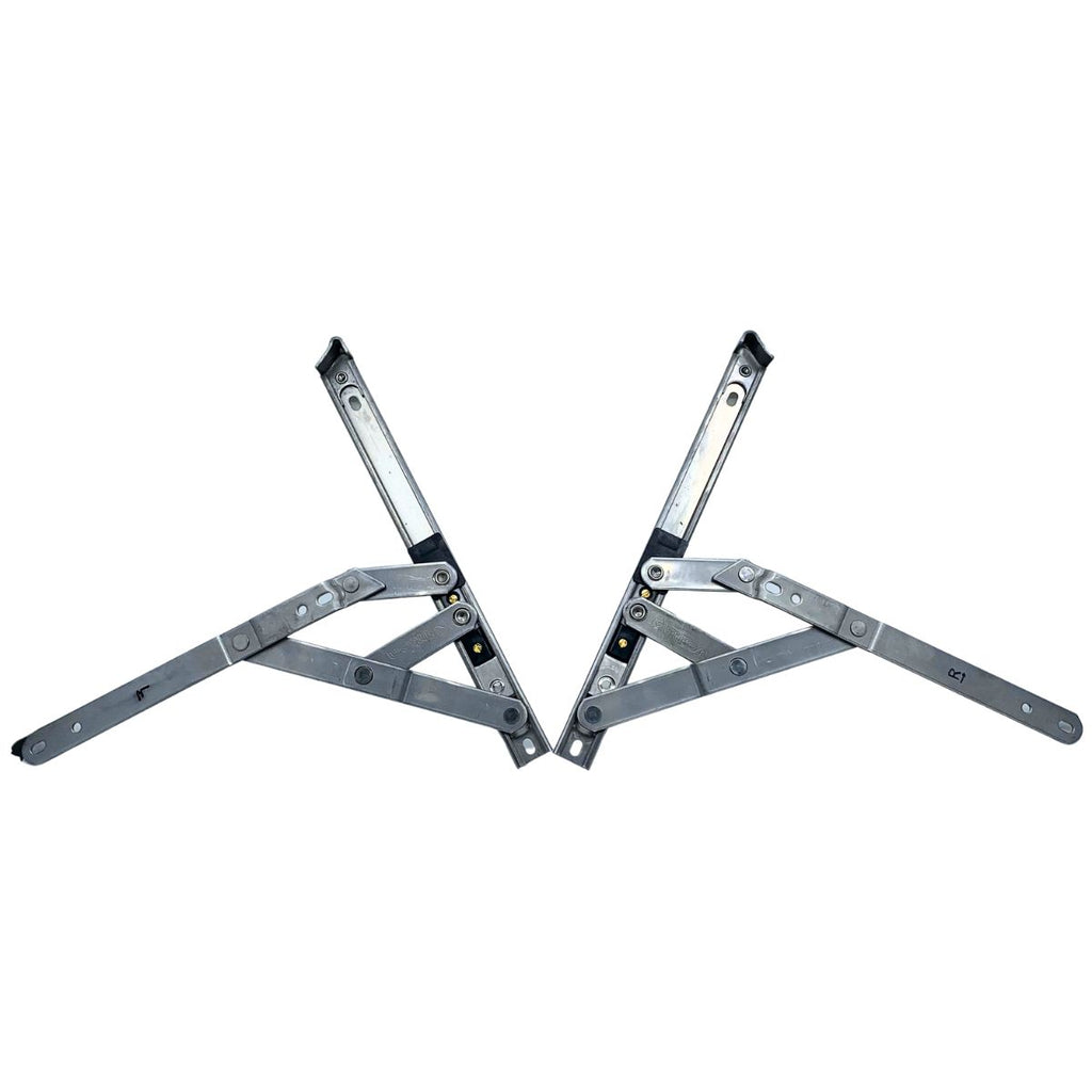 Bisagras de proyeccion de ventana (derecha + izquierda). Universal hasta Venta de 60KG. No limite de Medida solo Limite de Peso. Acero Inoxidable AISI 304. Ancho de canal europa de 14 mm. Se vende en PARES