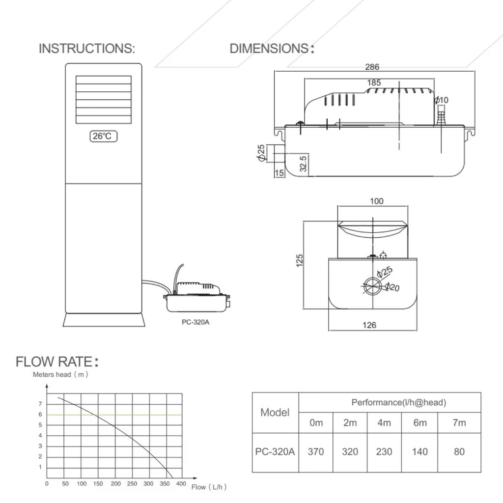 Bomba de drenaje Condensado Aire Acondicionado 320L/H, 126mm, 20W. Bomba de Agua para Aires Acondicionados y Sistemas de Refrigeración. 220 / 50 Htz