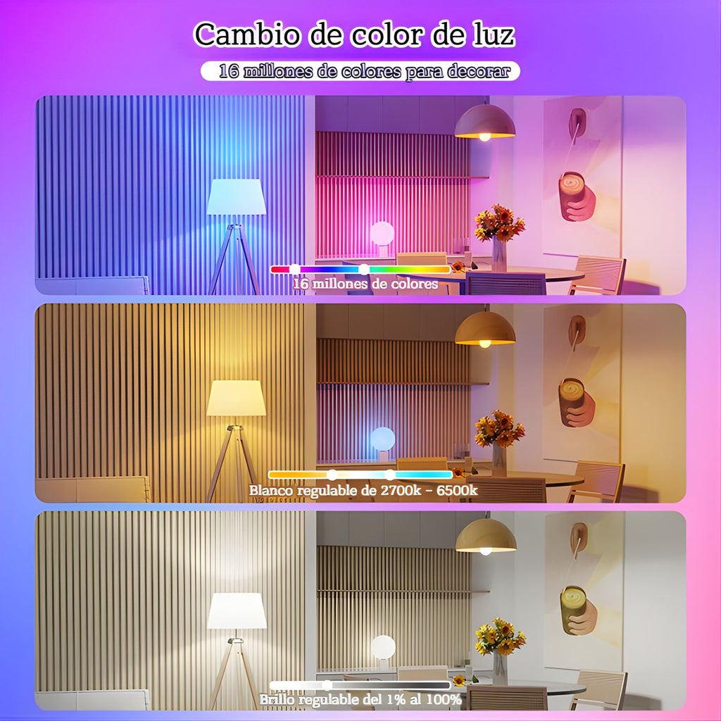 - Pack de 3 bombillos LED inteligentes con conectividad WiFi y Bluetooth para control remoto y estable.