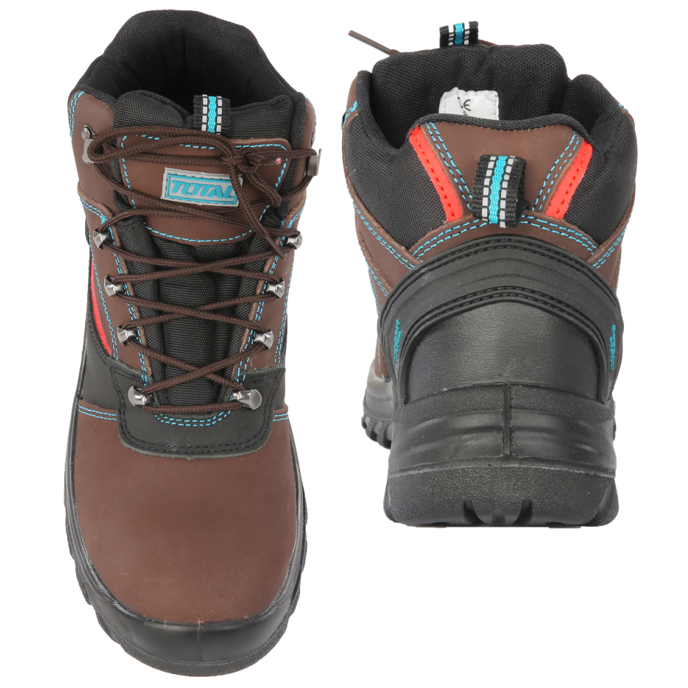 Botas de Cuero de Seguridad TOTAL. De Alta Calidad. Punta de Acero + Entresuela de Acero + Anticlavos + Antiresbalante + Anti vibracion + Dielectrico +Anti-fatiga. Buena Transpirabilidad. Suela de poliuretano de doble densidad. Estilo deportivo comodas y livianas. Color Marron/Negro.