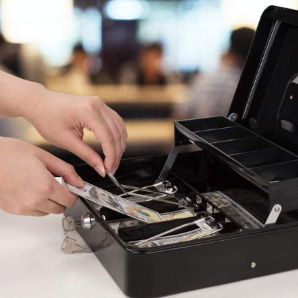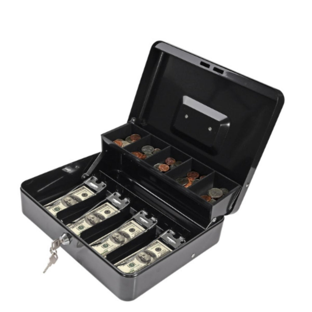 Caja Menuda Con Llave Y Bandeja De Monedas. Caja Chica Para Organizar Billetes 11.8''''x9.4''''x3.5'''' (30x24x9 cms). Color Negro.