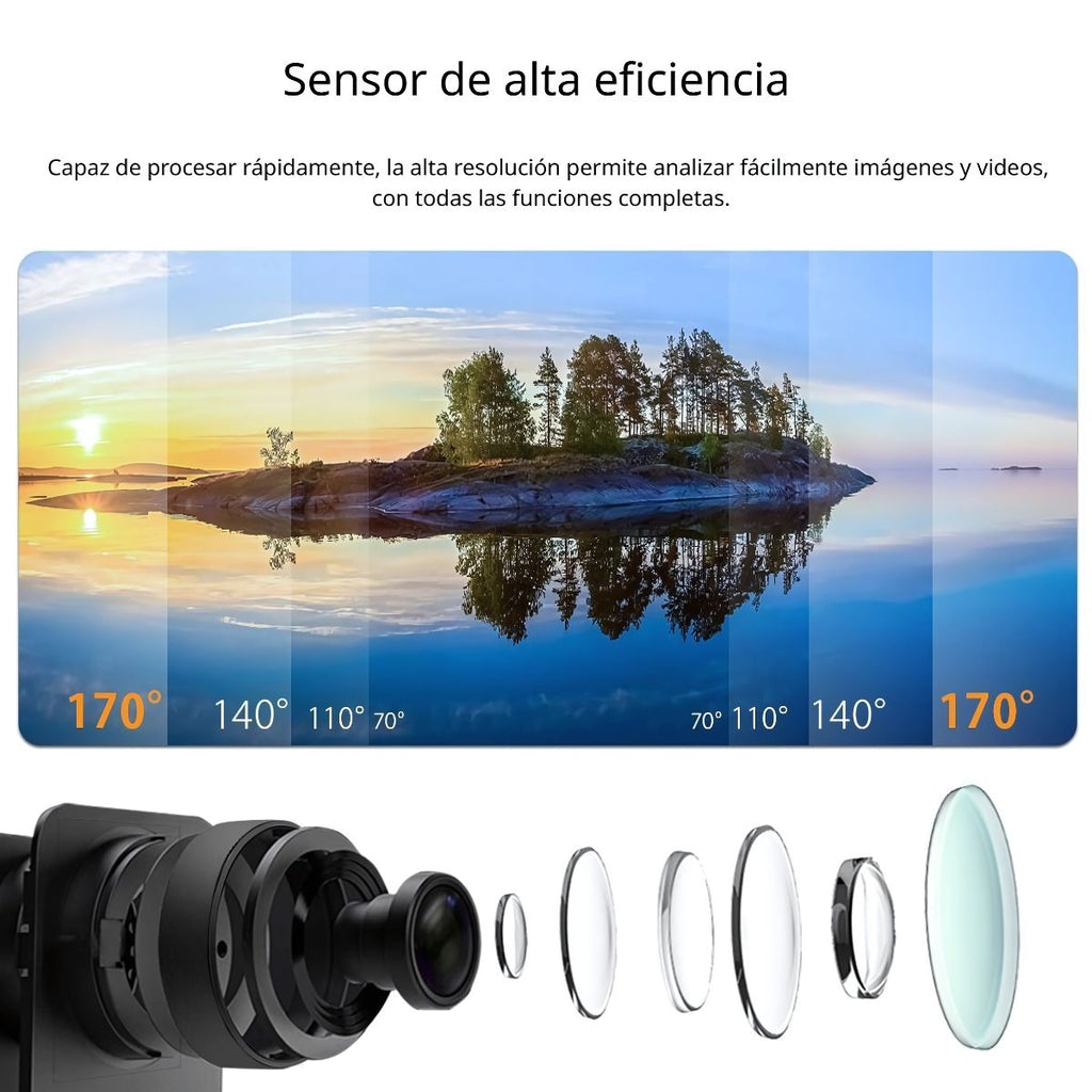 - Lente gran angular de 170° para tomas amplias y envolventes en deportes extremos o aventuras.