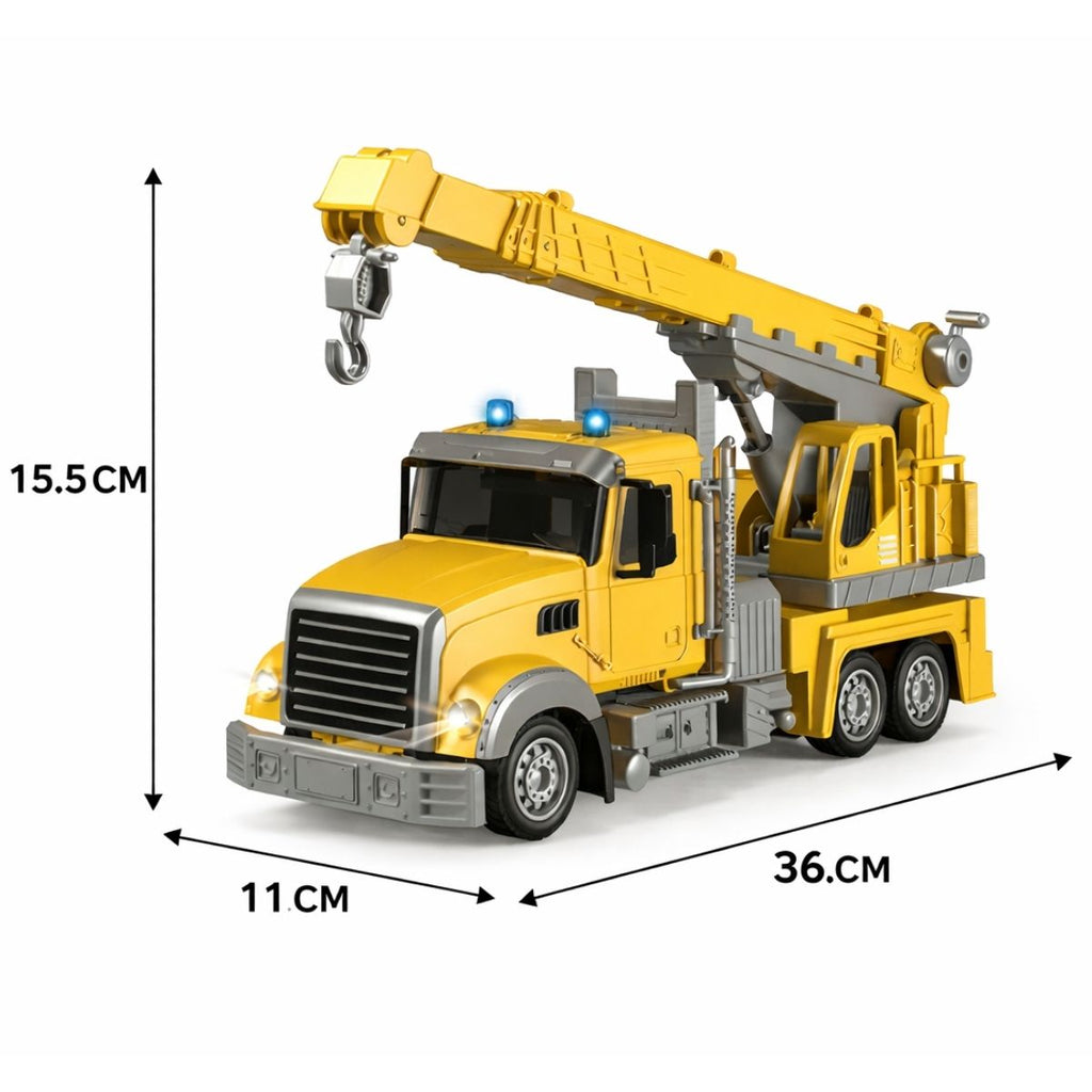 -Camión grúa de ingeniería a escala 1:24 con medidas aproximadas de 15.5 x 11x 36cm, ideal para uso infantil.