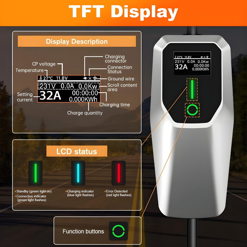 El cargador está equipado con un indicador LED en la caja de control. Este indicador muestra el estado de carga de su vehículo eléctrico, alertándole inmediatamente de cualquier problema potencial. Además, el cargador incorpora funciones de triple protección, incluyendo protección contra fugas, protección contra sobrecargas y protección contra bajo voltaje, lo que garantiza una experiencia de carga segura y confiable.