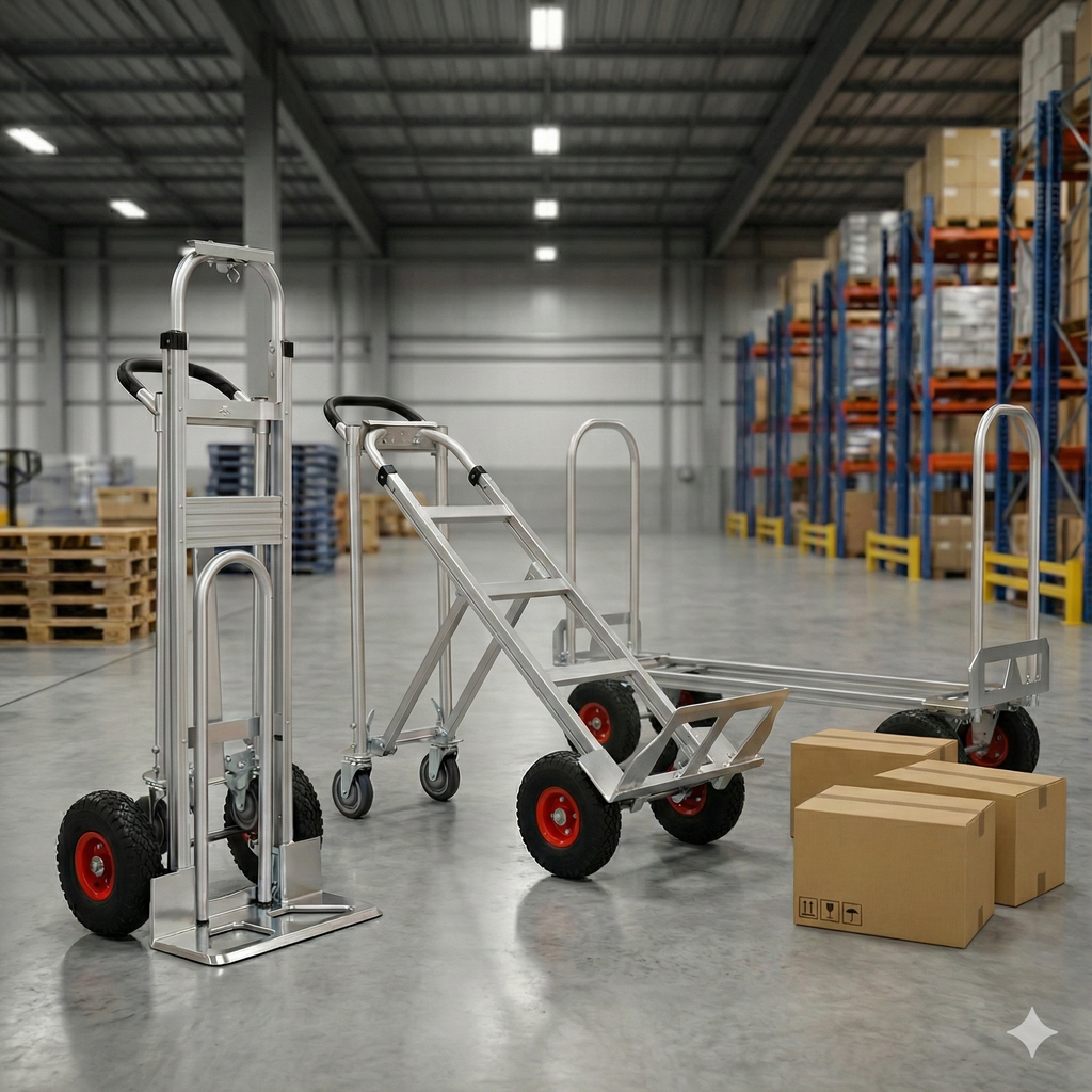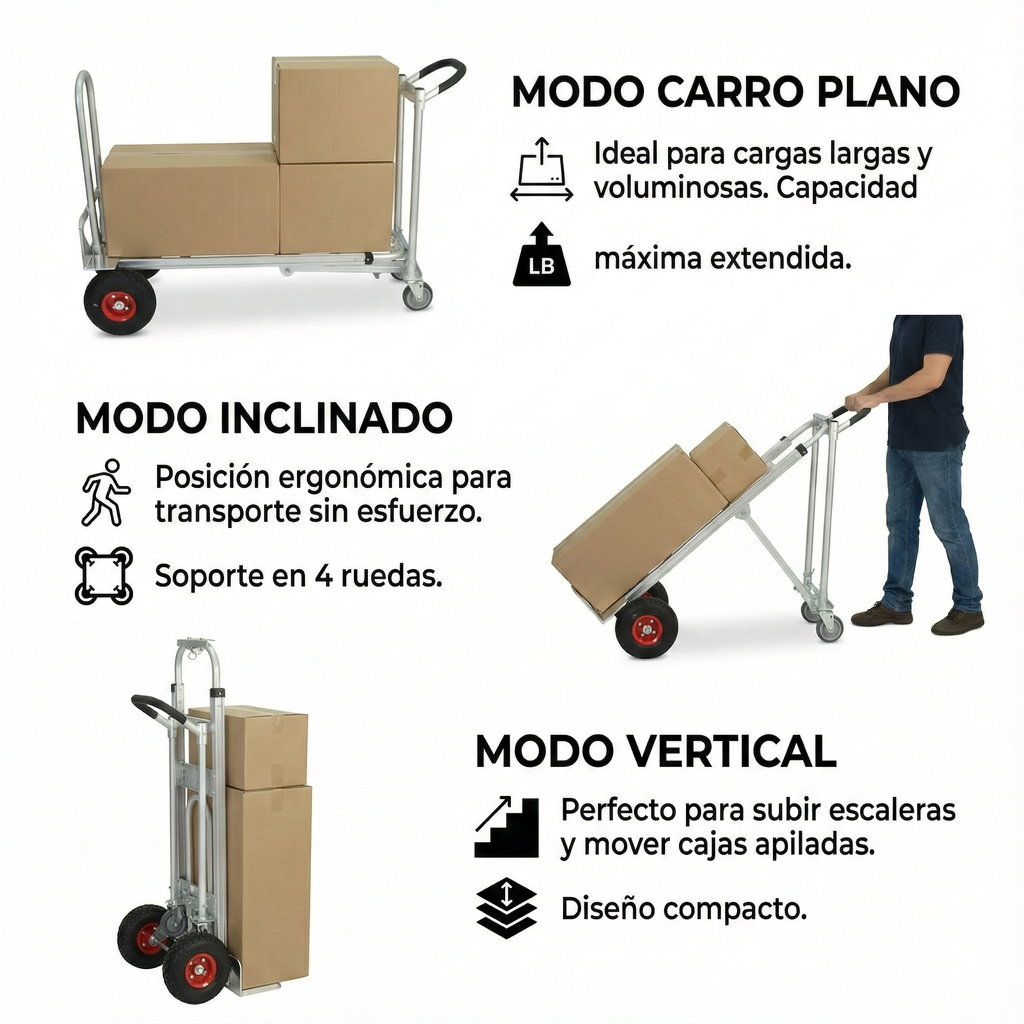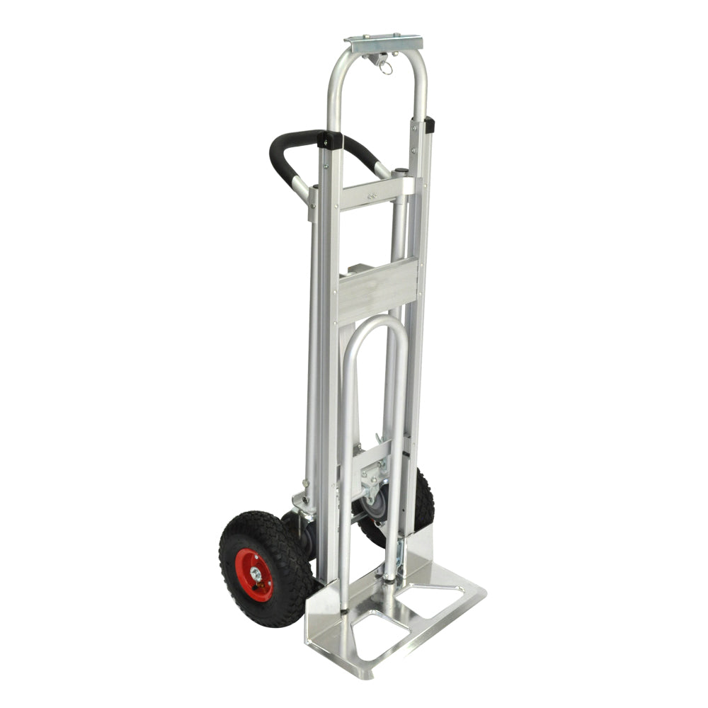 Carretilla de aluminio 3 en 1 convertible a carretón, y a carro inclinado para línea blanca y cajas grandes. 300kg Capacidad. 2 ruedas neumáticas 10'' y 2 ruedas 5'' rotativas. Plancha de 7.5'' *18''. medidas L1380*W520*H980mm.