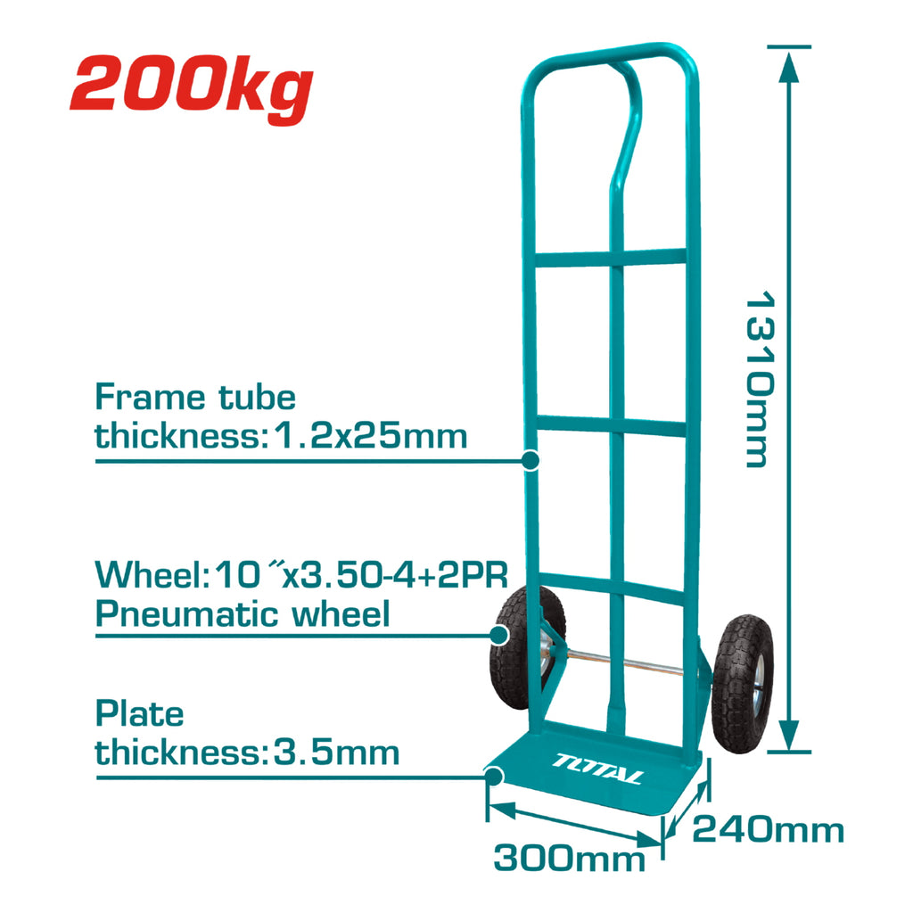Carretilla Manual de Carga para 200 Kg. Espesor de los Tubos: 1.2 x 25 mm. Espesor de la Placa de Carga: 3.5 mm. Rueda Neumatica: 10'' x 3.50 - 4 + 2 PR. Dimensiones: L / W1 / H / W2: 1310 x 550 x 460 x 220mm.