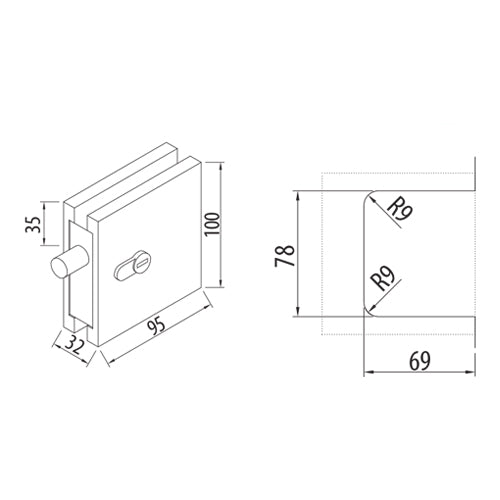 Cerradura cuadrada Tapa de acero 304, Cuerpo de Aleación ZAMAC. Acabado Satinado. Para vidrios de 8-12 mm, Certificaciones CE, ISO, SGS.