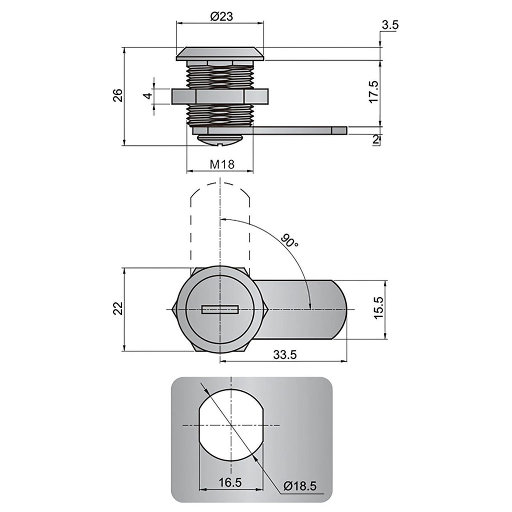 - Medidas precisas: Diámetro del cilindro Ø18 mm, longitud total 33.5 mm, altura total 26 mm.
