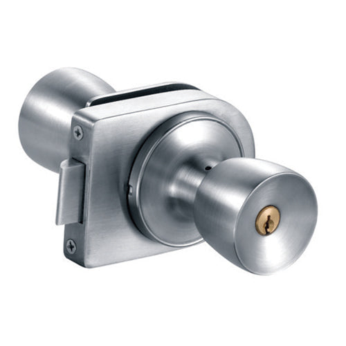 Cerradura de pomo, pestillo a 45 grados y seguro. 5 llaves. Acero inoxidable304. Satinado.Vidrio 10-12mm.