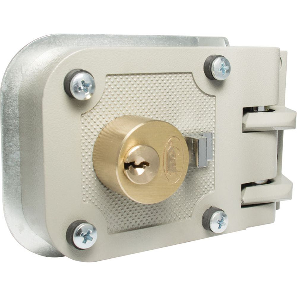 -Cerradura de sobreponer derecha para puerta corrediza, cilindro doble Lock.. -Cuerpo de hierro con base soldable.. -Picaporte integrado tipo mordaza con cierre de golpe vertical.. -Botón de bloqueo.. -Cilindro de llave de 5 pernos.. -3 llaves estándar. -Botón De Seguridad: Si