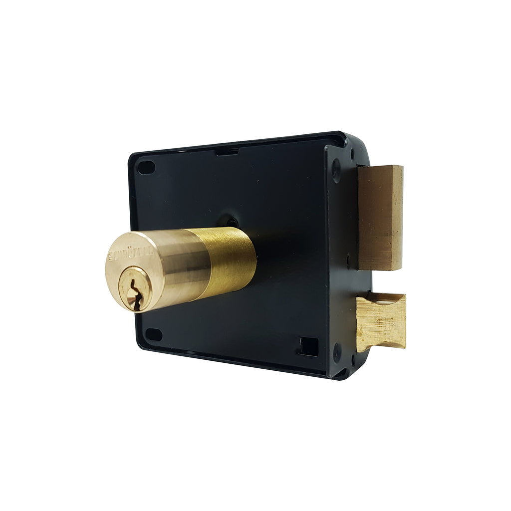 Cerradura de sobreponer puerta metálica para lado izquierdo. Con 3 llaves. Color negro. Con gatillo y cilindro de bronce Empaque en blíster. Marca Schroeder