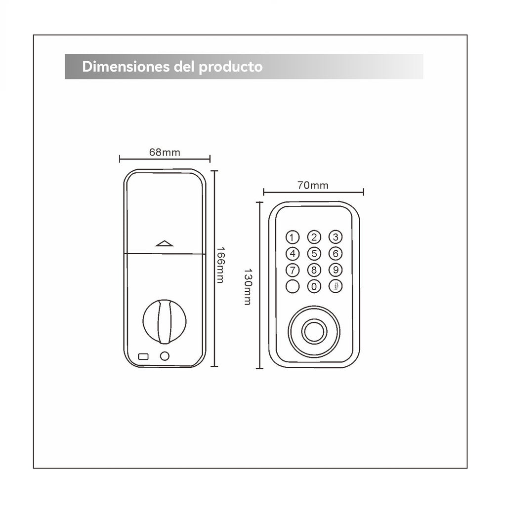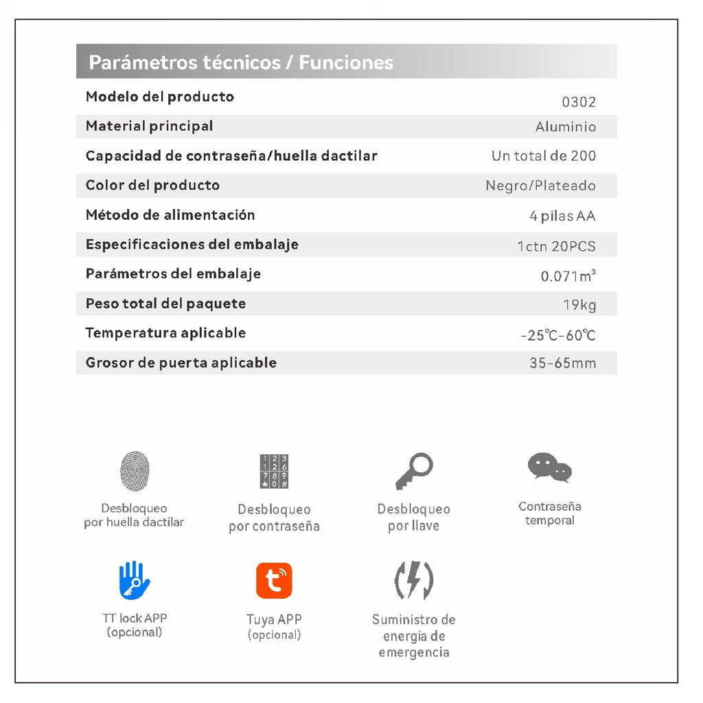 - Nuestra cerradura inteligente con cerrojo es compatible con puertas de 35 mm a 65 mm de grosor.
