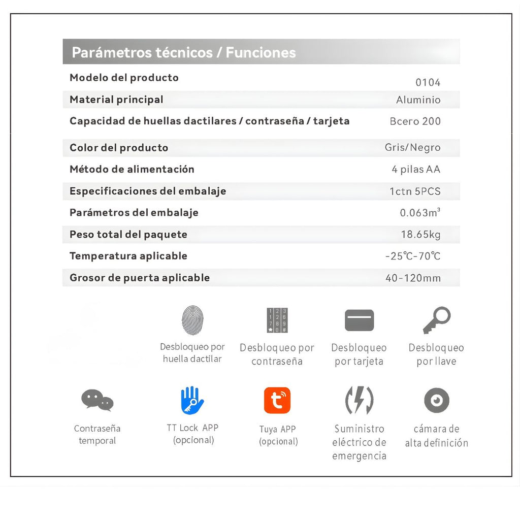 - Antirrobo- En caso de cinco entradas de contraseña incorrectas consecutivas o cualquier intento de alterar el panel, el sistema bloqueará y emitirá automáticamente una alarma, proporcionando una protección confiable contra robos.