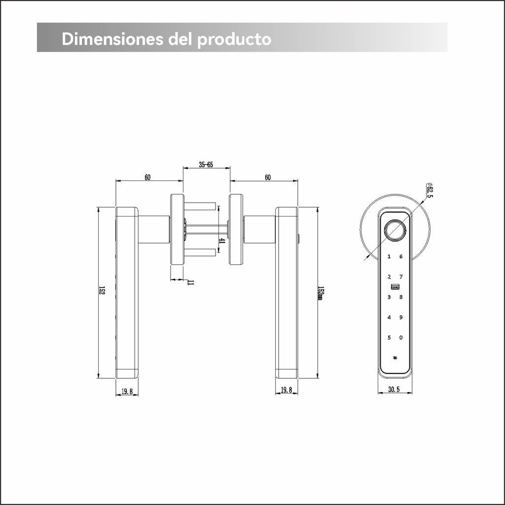 - Nuestra cerradura inteligente con cerrojo es compatible con puertas de 35 mm a 65 mm de grosor.