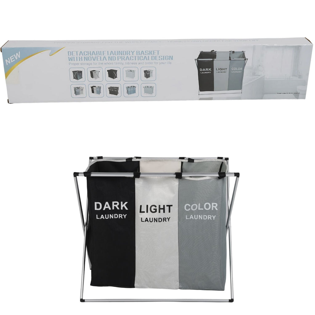 -Cesta de ropa con tres compartimentos para separar prendas claras, oscuras y de color, optimizando el proceso de lavandería.
