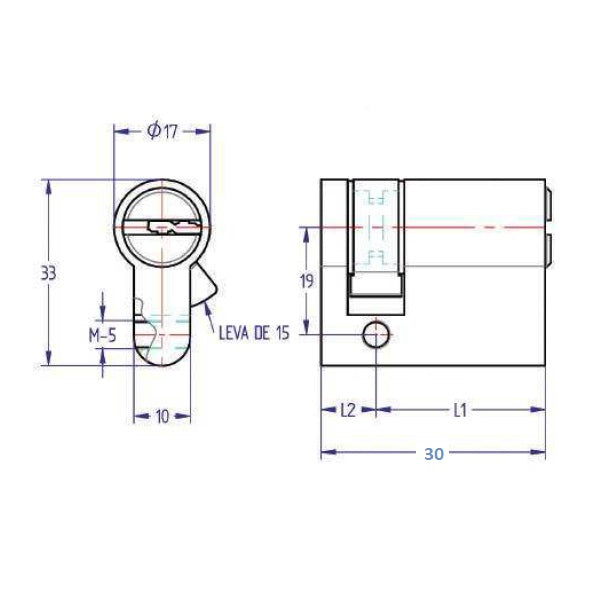 Cilindro Perfil Europeo de una Salida. Largo de 30 mm. Cuerpo Niquel
