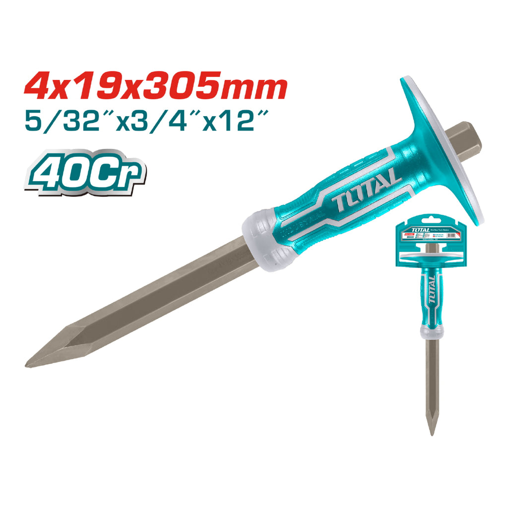 Cincel de hormigón de 4mm cabeza, mango 19mm, largo 305mm, Material 40cr. Alta calidad igual a Stanley. Nuevo estilo de mango. Tratamiento de calor y recubrimiento en polvo. Presentación Gancho de plástico.