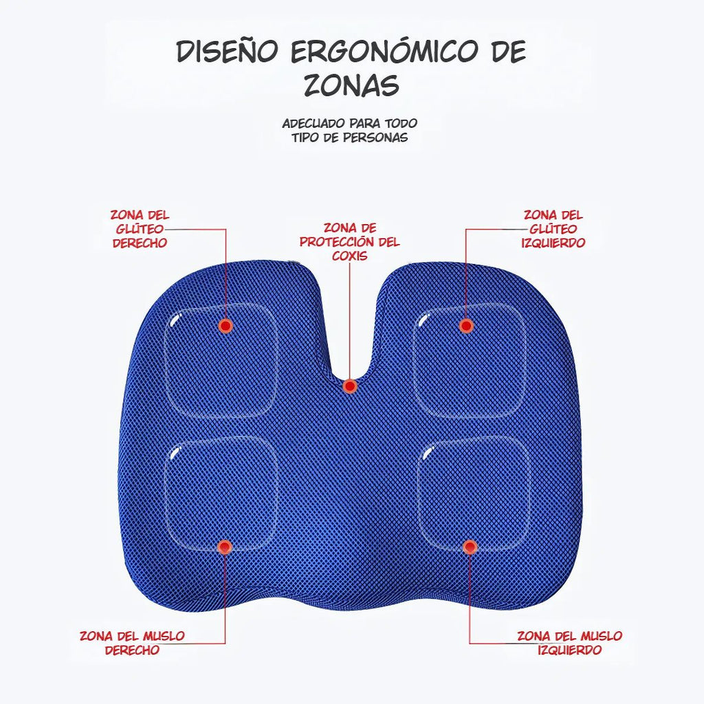 - Diseño ergonómico en “V” para reducir presión en coxis, glúteos y muslos.