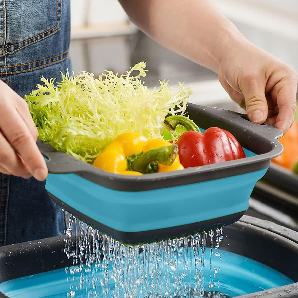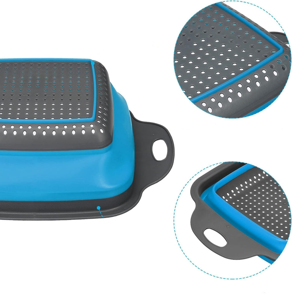 Este colador plegable de silicona sirve para drenar el agua de la mayoría de los alimentos como espaguetis, pasta, patatas, brócoli, judías verdes, zanahorias, espinacas y otras verduras.