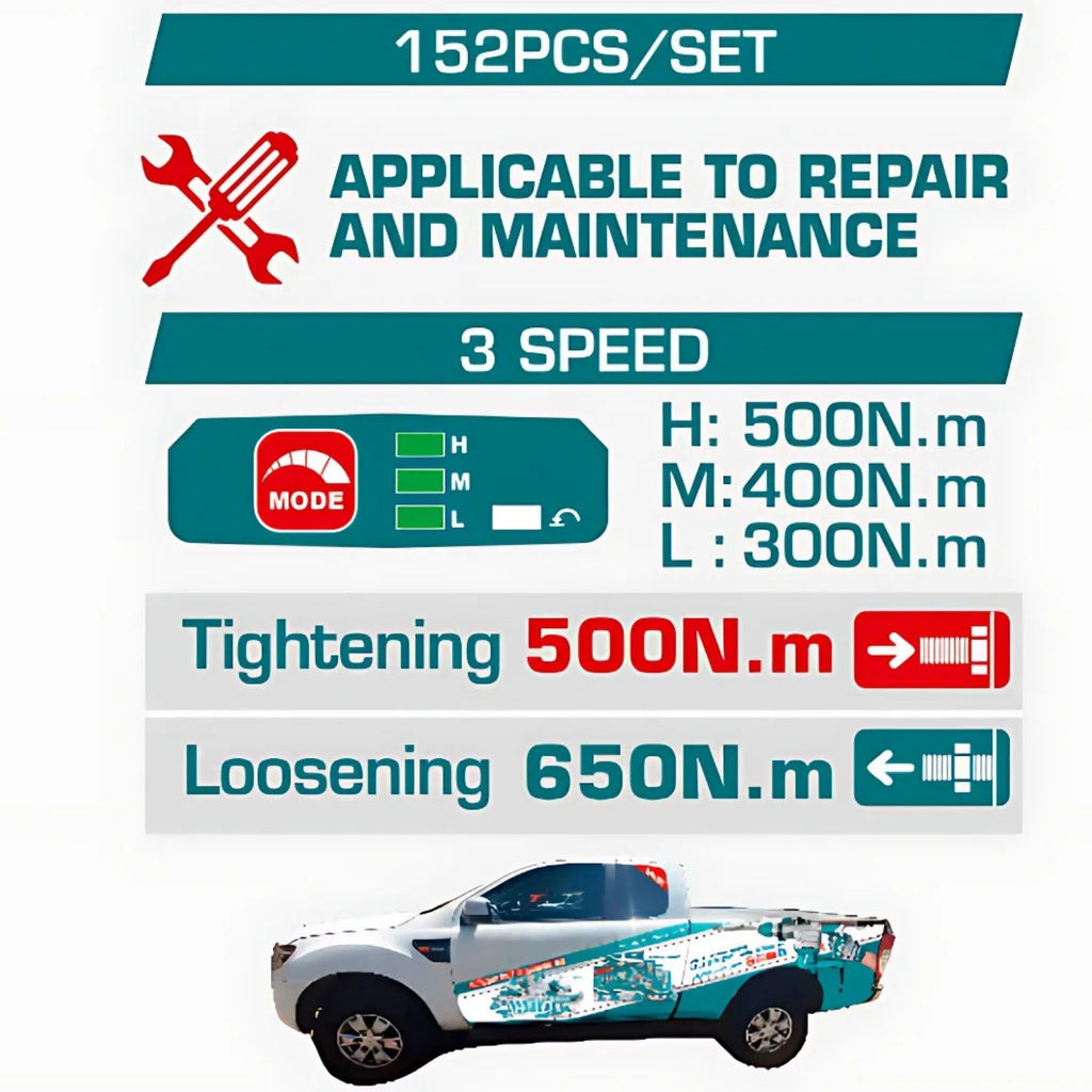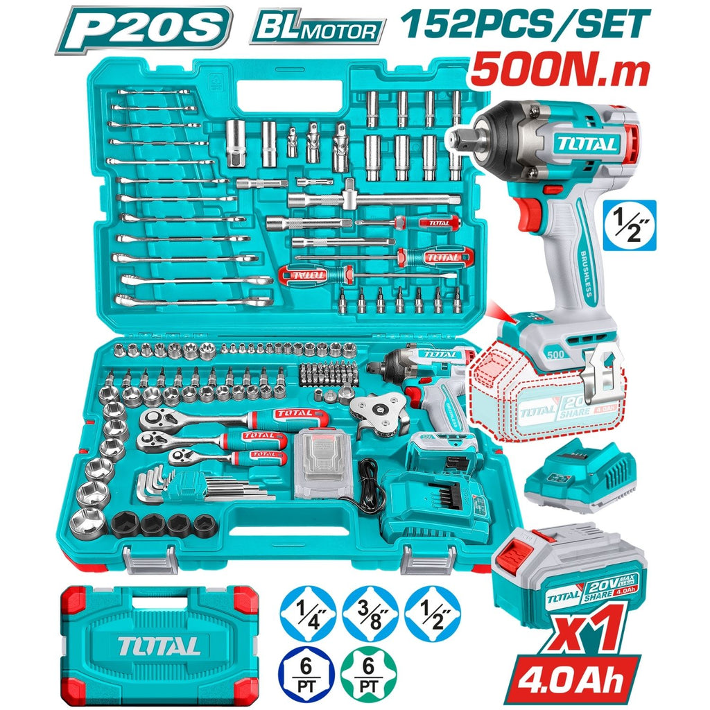 Combo del mes Total 20V Llave de Impacto Dado Cuadrado 1/2'' 500Nm. Set de Herramientas 152 piezas. Batería 4.0Ah y Cargador POCAS UNIDADES.