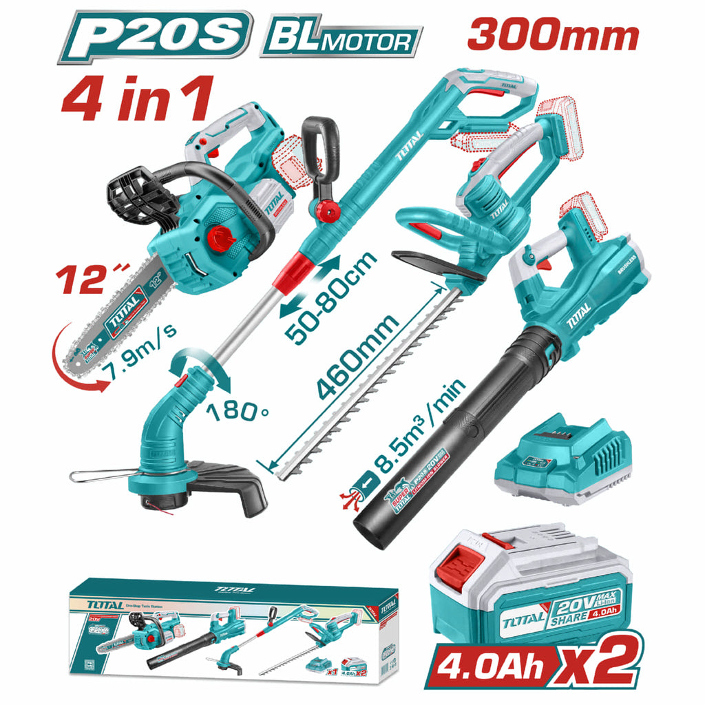 Combo del mes Total Motosierra 12'' Cortasetos Inalámbrico 2800 spm, Sopladora 144 km/h. 1800 rpm. Desmalezadora 8200rpm Incluye cargador y baterías. POCAS UNIDADES.
