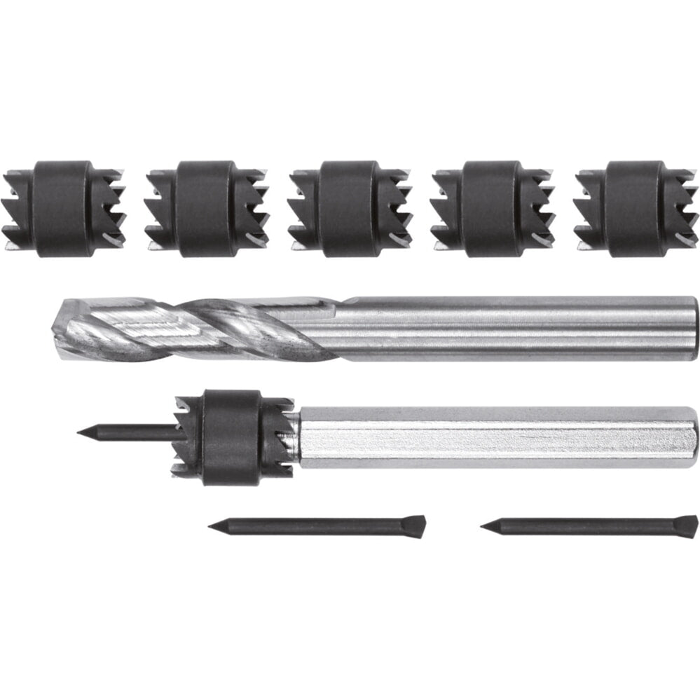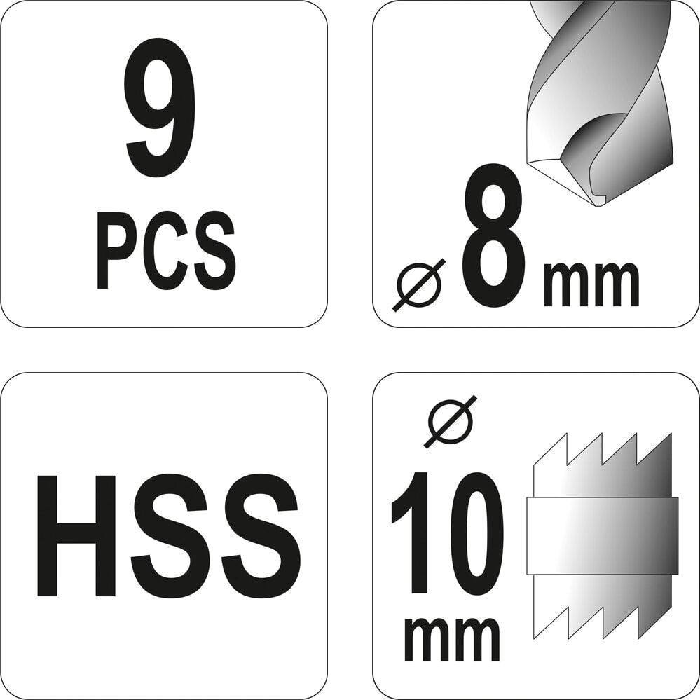 10 MM; PUNTOS CENTRALES Y CORONAS DE CORTE; ESTUCHE DE ALMACENAMIENTO DE METAL; MATERIAL: TALADRO- M35, OTRO- M2