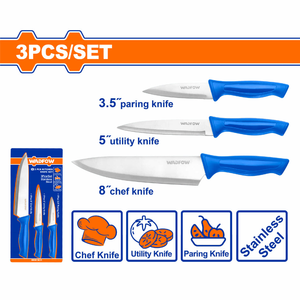 | Características | Juego de cuchillos de cocina de 3 piezas. Incluye:1 cuchillo de chef de 8 ", 1 cuchillo utilitario de 5" , 1 cuchillo de pelar de 3.5 " |