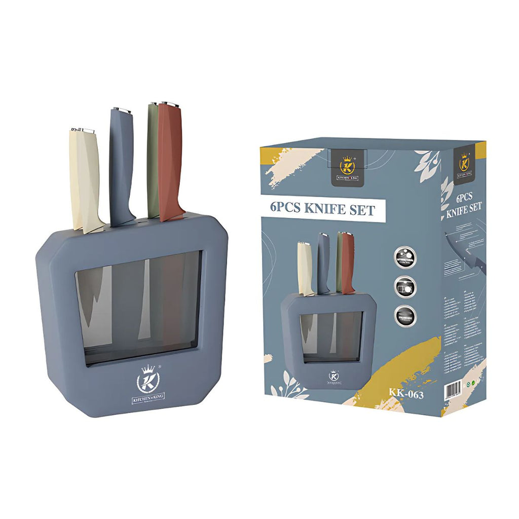 - Set de 6 piezas que incluye cuchillos de cocina variados: chef, deshuesar, pan, utilitario y pelador.