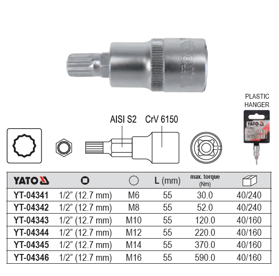 Dados De Punta Estriada Spline 1/2'', Punta: AISI S2, Granallado, Dado: CRV-6150, Acabado Satinado con Moleteado y Niquelado, HRC 58-62.