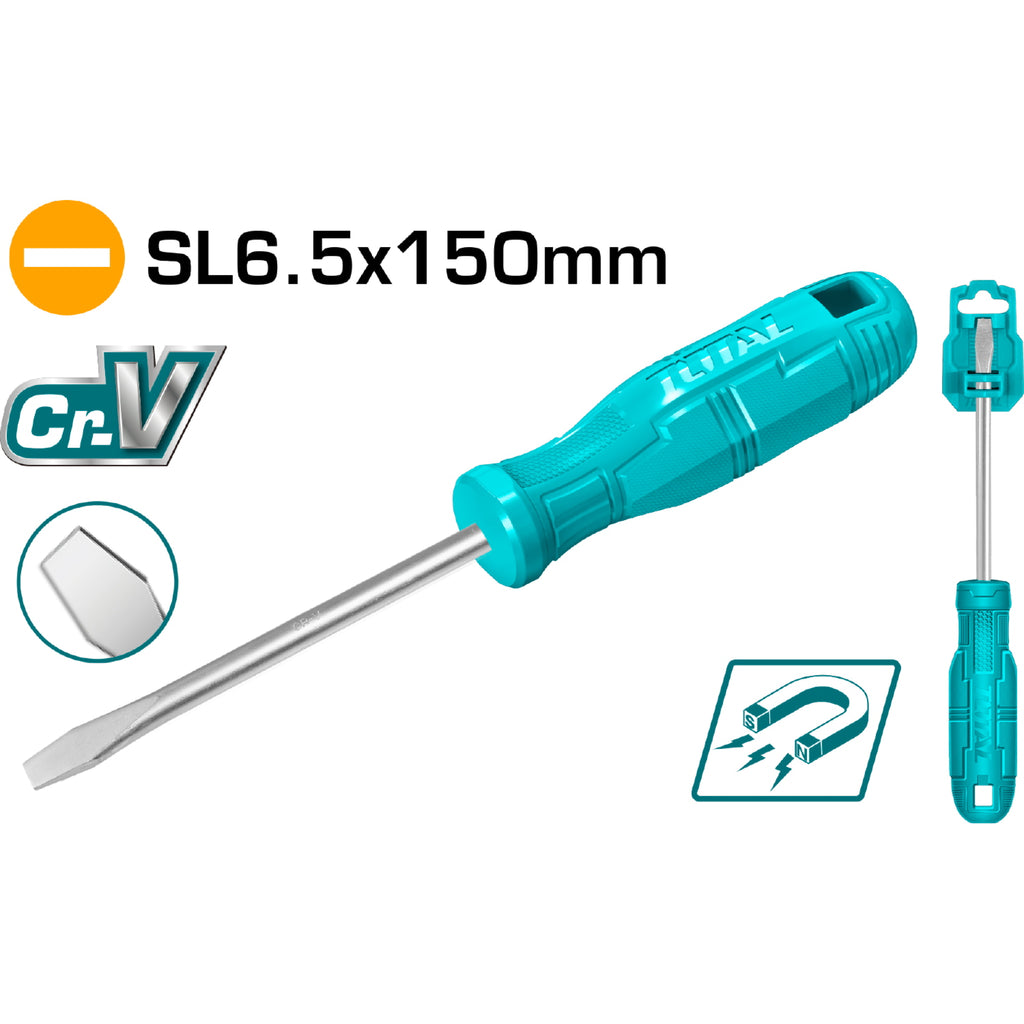 Destornillador plano 40 Cr, mango redondo. Ranura: 6 mm. Diámetro: 6 mm. Longitud: 150 mm
