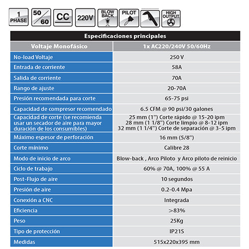 | Características | Fácil de usar con antorchas de bajo costo y consumibles, hecho con módulos IGBT SIEMENS, controlado por un microprocesador interno (MCU) incluye Puerto para conectar CNC, protección inteligente contra variación de voltaje y recalentamiento |