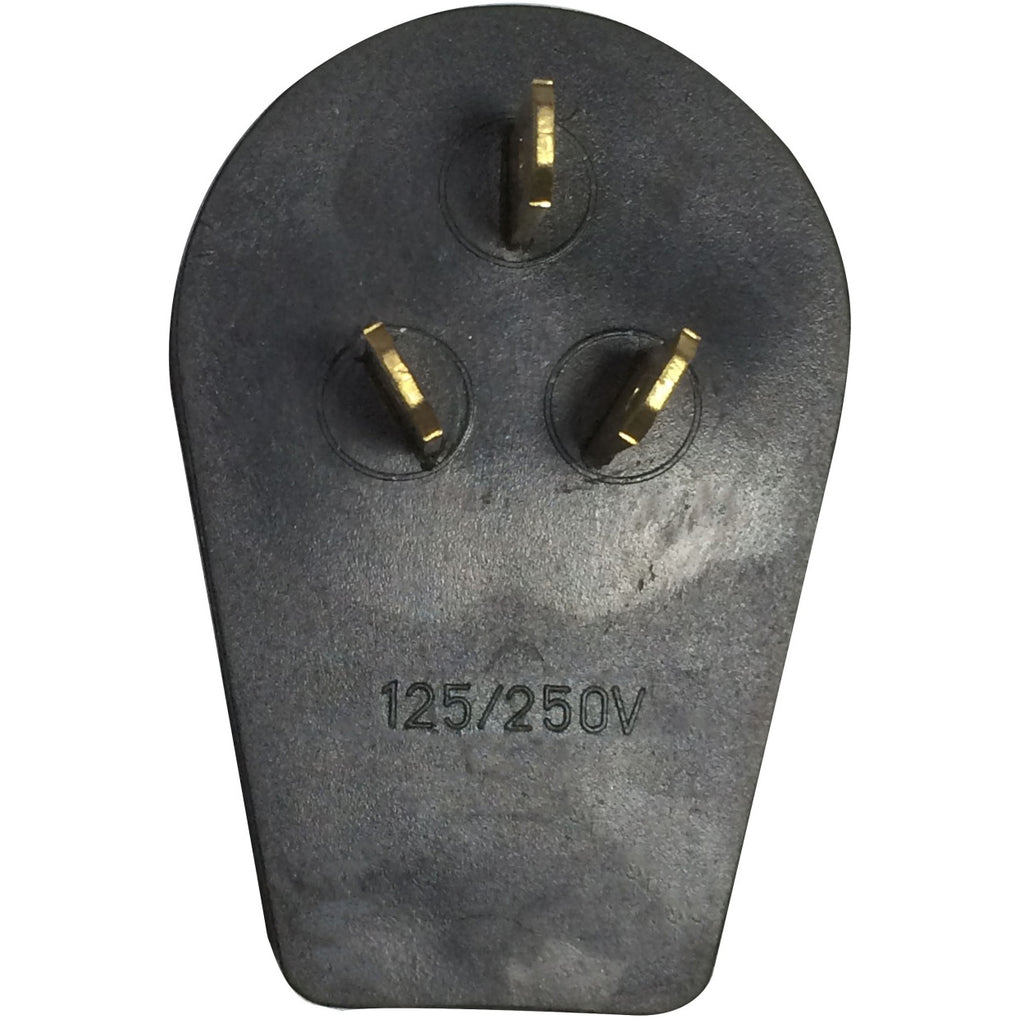 Enchufe Industrial de Trabajo Pesado. Conexion Nema 10-50P. 50A-220Volt. 60 Hz - 3 Polos. Material Plastico Alta Resistencia - Cobre. Color Negro. Sticker Codigo de Barra