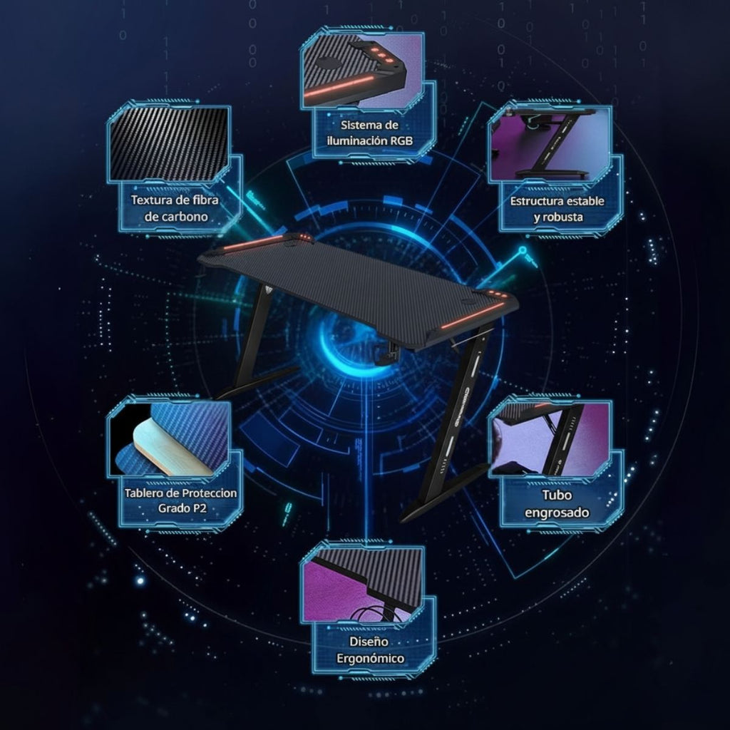 - Mesa gamer / escritorio para gaming con sistema de iluminación ambiental RGB con 12 colores y 5 niveles de brillo.